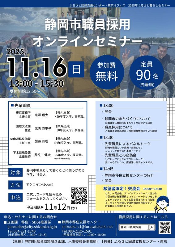 さらに、希望者限定でセミナー閉会後に先輩職員との交流会の時間を設けます。たっぷり時間をかけて、静岡市のこと・働く職員のことを知ってください!